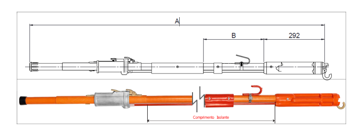 Bastão fabricado com tubo isolante de fibra de vidro impregnada com resina epóxi. Cabeçote fabricado de polietileno. Tarugo pultrudado de Ø3/8”. Gancho retrátil em latão na extremidade, operável por uma manopla de alumínio fundido regulável através de sistema de cremalheira e duas travas de segurança.